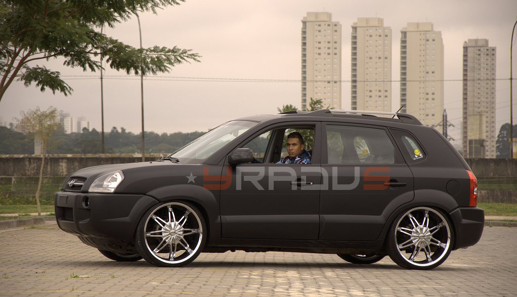 Desfilando muito baixo, graças a sua suspensão a ar, o Hyundai Tucson DUB recebeu a companhia de um jogo de rodas cromadas aro 22. Já seu interior recebeu um sofisticado e potente sistema de som com direito a um aparelho de DVD 2 DIN, 2 telas de 6″ para serem vistas dos bancos traseiros e um porta-malas bastante caprichado, com dois sub de 10″ com 600wrms cada, dois módulos de 1.000 wrms + um capacitor.